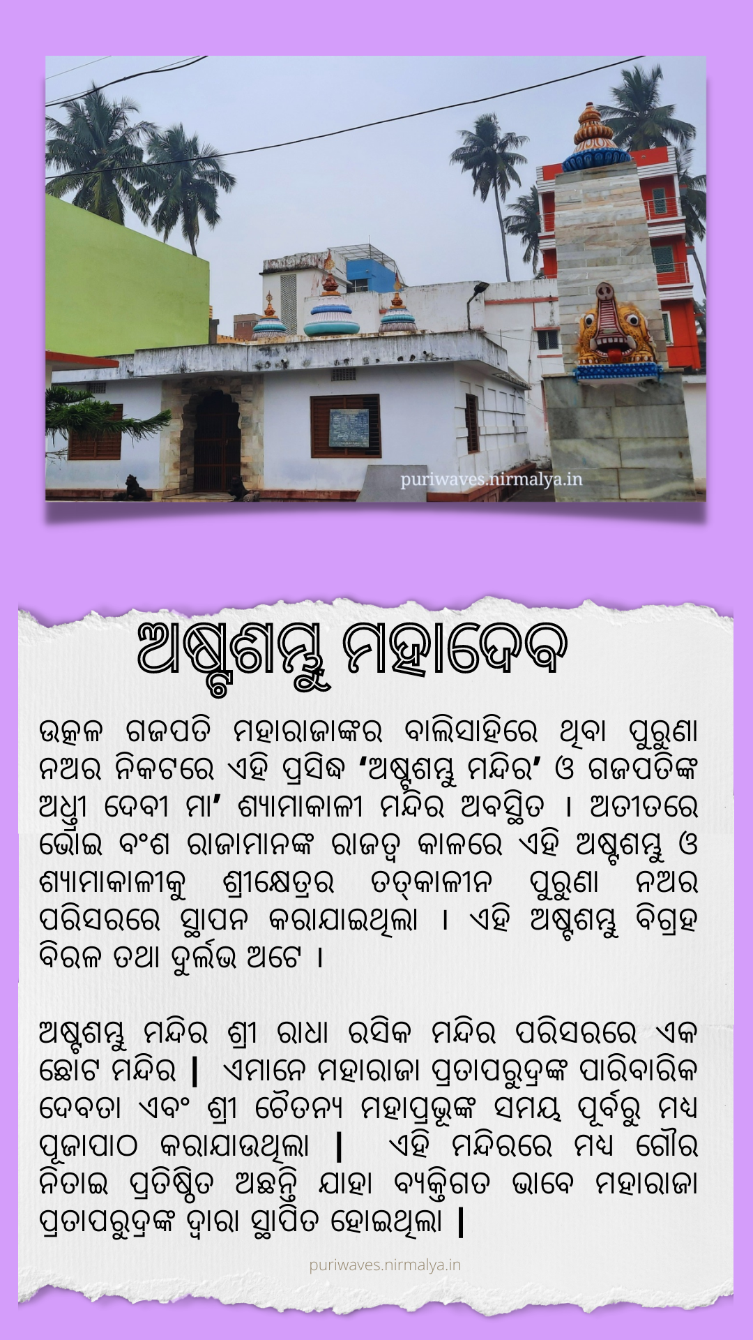 The renowned Ashtashambhu Mandir and the revered Goddess Maa Shyamakali Temple are iconic landmarks near the ancient palace in Balisahi, Puri within the realm of Utkal Gajapati Maharaja. These sacred sites carry profound historical and religious significance, dating back to the era of the Vhoi dynasty kings. Legend has it that during this period, the Ashtashambhu and Shyamakali deities were enshrined near the former Palace of Shrikshetra.