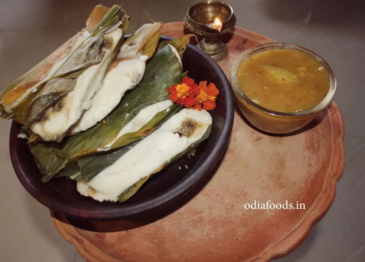 On Prathamastami in Odisha, a special cake named Haladi Patra Pitha is prepared as Prasad and distributed. This unique rice cake is filled with sweet stuffing and wrapped in turmeric plant leaves before being steamed. The cake, known as Enduri, is offered first to Sasthi Devi, the protector of children..